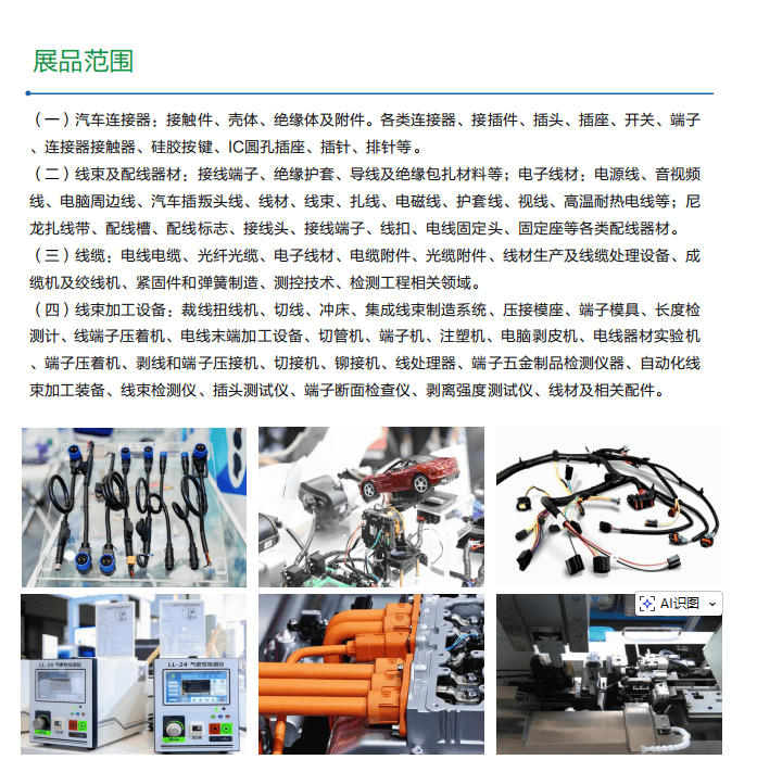 展品包括轿车连接器(触摸件、壳体、接插件、端子等)、线束及配线器件(端子、护套、线材、扎带等)、线缆(电线电缆、光纤光缆)、线束加工设备(裁线机、压接机、查验测验仪器)四大板块,贯穿“原材料-零部件-出产设备-查验测验认证”全链条,助力企业捕捉技能迭代与降本增效机会。